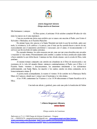 A quien pueda acompañarme, lo espero el viernes 10 de octubre en la Parroquia Stella Maris de Carrasco, donde nací y renací por el bautismo a la vida eterna.