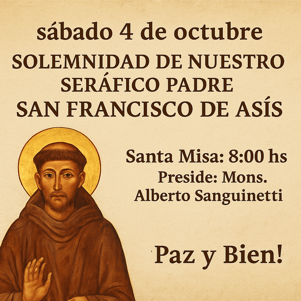 Invitamos a toda la comunidad parroquial a participar de esta celebración solemne y dar gracias a Dios por el testimonio luminoso de San Francisco. Que su ejemplo nos anime a vivir con un corazón abierto a la paz, la fraternidad y el servicio humilde.